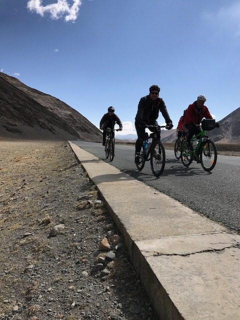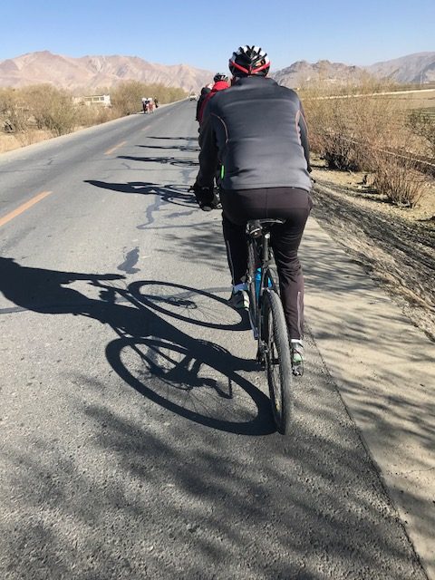 We did 85km today, average speed 21km. Ride was Tibetan flat – so we lost about 119m of elevation and then gained it back and added a bit more cause why not? We are at nearly 3600m. Mike was awesome – he pulled the last 40km so that Dale, Dave and I could draft; heaven given the incredible head wind that came up after lunch. We followed the river downstream and then upstream. Th mountains were glorious in the distance. Calories burned: 2611.